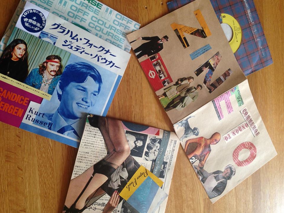 レコード全盛時代に作られた雑誌ならではの雰囲気あふれる写真、イラスト、文章などを切り抜き、EPレコード盤ジャケットサイズ(17.4×17.4)の紙に、好きなように貼りつけていきます。